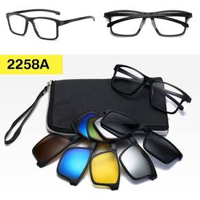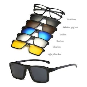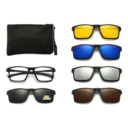 Item: 1 Óculos de lente transparente (Pode colocar grau) + 5 Lentes Clip On (Lente amarela, azul, marrom, espelhada e preta) para serem utilizadas por cima do óculos.