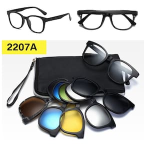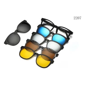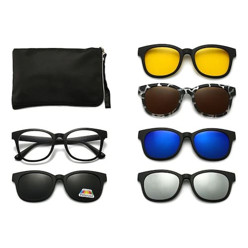 Item: 1 Óculos de lente transparente (Pode colocar grau) + 5 Lentes Clip On (Lente amarela, azul, marrom com a armação leopardo, espelhada e preta) para serem utilizadas por cima do óculos. Pode-se usar o óculos sem a Lente Clip On Para o uso noturno aconselha-se a lente amarela Material da armação: TR90 Unissex Lentes com tratamento polarizado Anti-reflexo Proteção UV400 Acompanha 1 case VINKIN