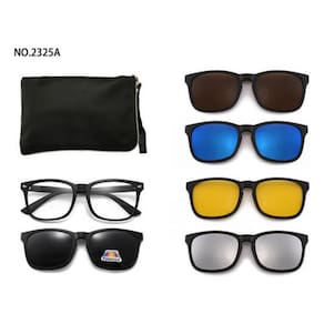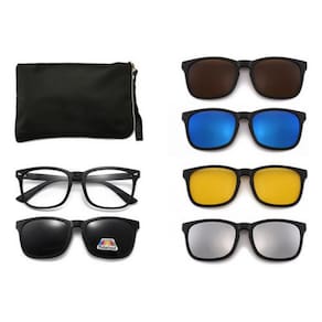 Item: 1 Óculos de lente transparente (Pode colocar grau) + 5 Lentes Clip On (Lente amarela, azul, marrom, espelhada e preta) para serem utilizadas por cima do óculos.