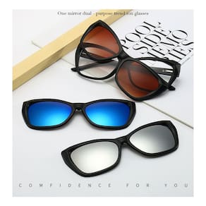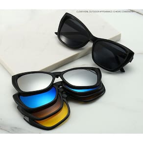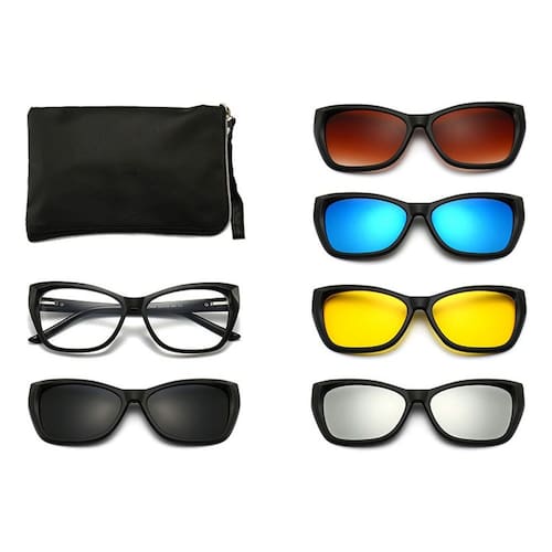 Item: 1 Óculos de lente transparente (Pode colocar grau) + 5 Lentes Clip On (Lente amarela, azul, marrom, espelhada e preta) para serem utilizadas por cima do óculos.