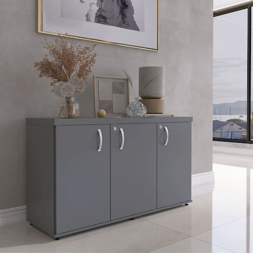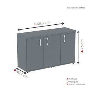 Ideal para escritórios, salas de reunião ou home office. Acabamento da Porta: BP Acabamento da Prateleira: BP Acabamento dos Pés: Polipropileno Ambiente Principal: Escritório Armário Suspenso: Não Complexidade da Montagem: Média: pode ser montado por mais de uma pessoa e/ou necessite de maior conhecimento para montagem Cor: Grafito Cor do Produto: Grafito Cor Interna: Grafito Escala de Brilho: Semi-Fosco Escala de Brilho da Porta: Semi-Fosco Escala de Brilho da Prateleira: Semi-Fosco Espessura do Tampo: 40 mm Formato do Armário: Retangular Itens Inclusos: 1 Armário e Kit Ferragens Linha ou Coleção: PE40 Manual de Montagem e Instalação: https://product-hub-prd.madeiramadeira.com.br/261591120/documents/c18bf4d4-d6ab-4944-9783-06b2437d447f3144221387017555271061887.pdf Marca: Pandin Móveis Material da Porta: MDP Material da Prateleira: MDP Material do Puxador da Porta: Poliestireno Material dos Pés: Polipropileno Material Principal: MDP Necessita Montagem: Sim Orientação do Armário: Horizontal Origem do Produto: Nacional Pés Reguláveis: Sim Peso: 38,804 kg Peso Máximo por Prateleira: 15 kg Possui Espelho: Não Possui Mesa Retrátil: Não Possui Nicho: Não Possui Pés: 06 Possui Portas: 03 Possui Prateleiras: 03 Quantidade de Armários: 1 Recomendações de Uso, Manutenção e Limpeza: Utilizar um pano levemente umedecido com água, para finalizar utilizar um pano seco. Sapatas Niveladoras: Sim Sistema de Montagem: parafuso Suporta Até (kg): 45 kg Tamanho do Armário: Baixo (Até 90cm) Tipo de Armário: Totalmente Fechado Tipo de Dobradiça/Corrediça da Porta: Aço Tipo de Puxador da Porta: Externo Marca: Não Informado
