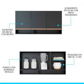Armário Aéreo 03 Portas 120x52cm Mdp 0451 Menu Móveis Preto O Armario Aereo para Cozinha Sabrina e a escolha ideal para quem busca praticidade, organizacao e beleza na cozinha. Com 03 portas e prateleiras internas, oferece espaco funcional para armazenar utensilios e mantimentos, deixando tudo sempre bem organizado e ao alcance das maos. Por ser parte de um sistema de cozinha modulada, voce pode combina-lo com outros modulos e criar diferentes composicoes conforme o espaco disponivel. O design moderno, aliado aos puxadores em perfil, garante sofisticacao e elegancia ao ambiente. Produzido em MDP de 15 mm com acabamento em pintura UV, assegura durabilidade e resistencia.