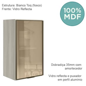Armário Aéreo para cozinha desenvolvido para composições modernas e funcionais. Fabricado 100% em MDF, com estrutura de 15 mm e forro de fundo de 3 mm. Além disso, conta com dobradiças 35mm com amortecedor, que garantem fechamento suave e silencioso. O puxador em perfil de alumínio completa o produto com um visual funcional e contemporâneo, enquanto o vidro reflecta traz um toque sofisticado e reflexivo, ampliando visualmente o ambiente com elegância. Este móvel chegará em sua casa separado em 02 volumes.