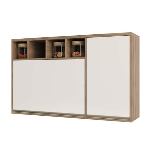 Armário Aéreo 120 cm 1 Porta de abrir 1 Porta Basculante e Nicho Superior Mel Luciane Móveis. O Armário Aéreo com 120 cm Mel foi desenvolvido aliando beleza e praticidade ao seu ambiente. Conta com 1 porta de abrir, 1 porta basculante com pistão a gás 80N, 2 prateleiras interna, puxador em alumínio gola. Acompanha sistema para fixação na parede.
