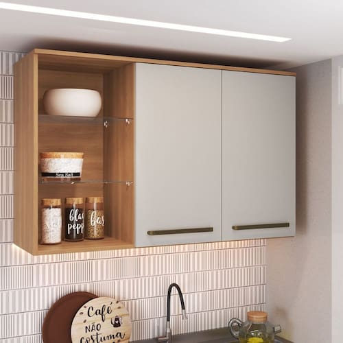 Aéreo 1,2m Isabelle, produto com ótimo acabamento todo em MDP 15mm, possui duas portas de bater com dobradiças com amortecimento, prateleiras internas, prateleiras de vidro na sua lateral e puxador alumínio. É um módulo avulso da cozinha modulada Isabelle, ideal para compor sua cozinha da forma que desejar, oferecendo diversas combinações, você pode completar sua cozinha adquirindo outros módulos que são vendidos avulsos. Acabamento da Prateleira: Finish Foil Escala de Brilho da Prateleira: Fosco Acabamento da Porta: Finish Foil Escala de Brilho da Porta: Fosco Material do Puxador da Porta: Alumínio Acompanha Tampo: Não Ambiente Principal: Cozinha Balcão Suporta Pia: Não codigo_ean: 7909903717035 Complexidade da Montagem: Média: pode ser montado por mais de uma pessoa e/ou necessite de maior conhecimento para montagem Cor: Freijo/Arenas Cor do Produto: Freijó/Arenas Escala de Brilho: Fosco Espessura do Material da Estrutura: 15 mm Informações Complementares: Total Itens Inclusos: 1 Armário Aéreo, Manual de Montagem, Kit Ferragens Linha ou Coleção: Isabelle Manual de Montagem e Instalação: https://product-hub-prd.madeiramadeira.com.br/911582/documents/c8cc88ee-6724-453a-b866-0d19fb7923e5456717a1400862is1630manual.pdf Marca: Delmarco Móveis Material da Dobradiça/Corrediça da Porta: Aço Material da Porta: MDP Material da Prateleira: MDP modular: Sim Montagem Flex: Não Necessita Montagem: Sim O Balcão Acompanha Pia: Não Origem do Produto: Nacional Peso: 34,72 kg Peso Máximo por Prateleira: 5 kg Possui Pés: Não Possui Porta com Vidro: Sim Possui Portas: Sim Possui Prateleiras: Sim Possui recorte para Cooktop: Não Possui Vidro: Sim Produto Montado: Sim Recomendações de Uso, Manutenção e Limpeza: Para limpeza do móvel, use uma flanela seca Sistema de Montagem: Parafusos, Cavilhas, Minifix Suporta Até (kg): 25 kg Tipo de Dobradiça da Porta: Soft close Tipo de Puxador da Porta: Externo