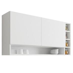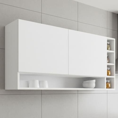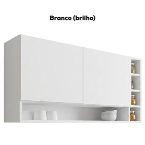 Armário Aéreo Vanessa, ideal para otimizar o espaço da sua cozinha. Produzido em MDP 12/15 mm (fundo 3 mm) com acabamento em pintura UV. Possui portas com dobradiças metálicas e puxadores em alumínio, além de nicho central e lateral estilo adega para armazenar garrafas ou temperos, oferecendo amplo espaço interno. Produto entregue em 01 volume.