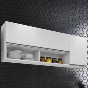 Armário Aéreo Maya, visual moderno e acabamento elegante que valorizam qualquer ambiente com praticidade! Estrutura em MDP 15 mm com acabamento BP. Composto por portas (uma sendo basculante) com dobradiças metálicas, puxadores em perfil de alumínio, nichos externos para armazenar temperos ou objetos decorativos, além de ampla prateleira interna. Produto será entregue em 01 volume.