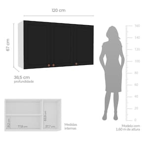 O armário aéreo de cozinha possui 3 portas em MDF usinado em baixo relevo para deixar sua casa com muito estilo. Puxadores Pontual na cor cobre. Sua prateleira interna suporta até 10Kg oferecendo armazenamento perfeito para todos os seus utensílios. Sua largura é de 120 cm, 67 cm de altura e 36,5 cm de profundidade. Acabamento da Prateleira: Pintura UV Escala de Brilho da Prateleira: Fosco Acabamento da Porta: Pintura UV Escala de Brilho da Porta: Fosco Material do Puxador da Porta: Plástico Acompanha Tampo: Não Ambiente Principal: Cozinha codigo_ean: 7909903971949 Complexidade da Montagem: Média: pode ser montado por mais de uma pessoa e/ou necessite de maior conhecimento para montagem Cor: Branco / Preto Cor do Produto: Branco / Preto Cor Flex: Não Cor Interna: Branco Escala de Brilho: Fosco Espessura do Material da Estrutura: 15 mm Informações Complementares: Até 10 kg sobre a prateleira do armário Itens Inclusos: 1 móvel desmontado, kit de ferragens, termo de garantia e manual de montagem. Linha ou Coleção: Pérola Manual de Montagem e Instalação: https://product-hub-prd.madeiramadeira.com.br/959770/documents/d00f7d78-a84d-4394-82c2-468585f62b4be2253681493317246800738272.pdf Material da Dobradiça/Corrediça da Porta: Metálica Material da Porta: MDF Material da Prateleira: MDP modular: Sim Montagem Flex: Não Necessita Montagem: Sim O Balcão Acompanha Pia: Não Origem do Produto: Nacional Peso: 26,82 kg Peso Máximo por Prateleira: 10 kg Possui Pés: Não Possui Portas: Sim Possui Prateleiras: Sim Possui recorte para Cooktop: Não Possui Vidro: Não Produto Montado: Sim Recomendações de Uso, Manutenção e Limpeza: Utilize um pano macio umedecido com água e sabão neutro, seguido de pano seco. Não utilize produtos químicos ou abrasivos para limpeza, pois estes danificam o revestimento do móvel. Sistema de Montagem: Cavilha, parafuso, minifix e prego Suporta Até (kg): 10 kg Tamanho Indicado da Pia: L: 120 x P: 52 cm Tamanho Indicado do Tampo: L: 120 x P: 52 cm Tipo de Dobradiça da Porta: Soft close Tipo de Puxador da Porta: Externo