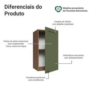 O acabamento de alta resistência da estrutura é tom amadeirado Rustic e das portas em Verde. Possui uma textura suave ao toque, trazendo leveza e sofisticação ao ambiente. O destaque vai para os puxadores ponto em ouro envelhecido, feitos com metal resistente. Outro diferencial está no detalhe chanfrado das frentes, que forma molduras elegantes e dá profundidade ao design, refletindo o estilo americano com um toque moderno.