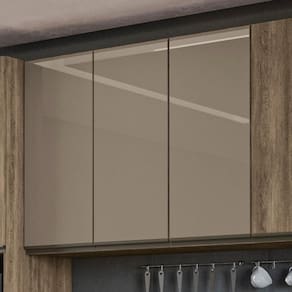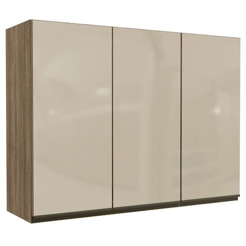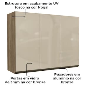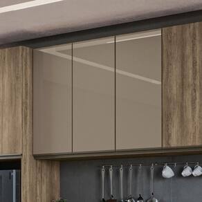 Design que une estética, robustez e eficiência para seu dia a dia. O Armário aéreo é um móvel suspenso, produzido 100% em MDP de 15 mm com acabamento em pintura texturizada UV (fosco) ou (semibrilho). Possui 3 portas em vidro de 3 mm equipadas com dobradiças metálicas, 4 prateleiras internas e puxadores em alumínio. Este móvel chegará na sua casa separado em 02 volumes.