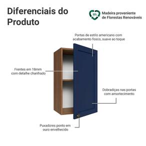 O acabamento de alta resistência da estrutura é em tom amadeirado Rustic e das portas em Azul. Possui uma textura suave ao toque, trazendo leveza e sofisticação ao ambiente. O destaque vai para os puxadores ponto em ouro envelhecido, feitos com metal resistente. Outro diferencial está no detalhe chanfrado das frentes, que forma molduras elegantes e dá profundidade ao design, refletindo o estilo americano com um toque moderno.