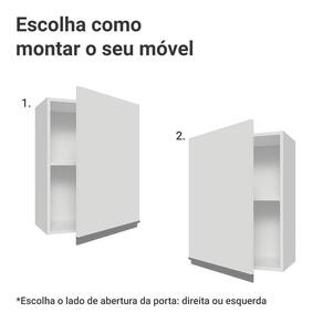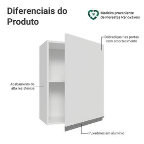 Produzido com materiais de alta qualidade, o armário oferece excelente aproveitamento interno, com prateleira ideal para organizar louças, utensílios e mantimentos. As portas possuem sistema de amortecimento, garantindo um fechamento suave e silencioso. Os puxadores no estilo cava, em perfil de alumínio, completam o visual moderno e elegante do móvel.