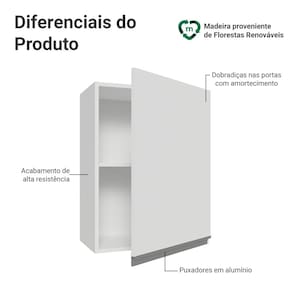 Produzido com materiais de alta qualidade, o armário oferece excelente aproveitamento interno, com prateleira ideal para organizar louças, utensílios e mantimentos. As portas possuem sistema de amortecimento, garantindo um fechamento suave e silencioso. Os puxadores no estilo cava, em perfil de alumínio, completam o visual moderno e elegante do móvel.