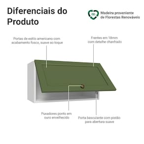 O acabamento de alta resistência da estrutura é em Branco e da porta em Verde. Possui uma textura suave ao toque, trazendo leveza e sofisticação ao ambiente. O destaque vai para os puxadores ponto em ouro envelhecido, feitos com metal resistente. Outro diferencial está no detalhe chanfrado das frentes, que forma molduras elegantes e dá profundidade ao design, refletindo o estilo americano com um toque moderno.