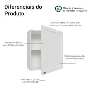 O acabamento de alta resistência da estrutura e das portas é em Branco. Possui uma textura suave ao toque, trazendo leveza e sofisticação ao ambiente. O destaque vai para os puxadores ponto em ouro envelhecido, feitos com metal resistente. Outro diferencial está no detalhe chanfrado das frentes, que forma molduras elegantes e dá profundidade ao design, refletindo o estilo americano com um toque moderno.