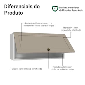 O acabamento da estrutura é branco e da porta no tom crema, reforçando o visual elegante da linha Vik. Possui uma textura suave ao toque, trazendo sofisticação ao ambiente. O destaque fica por conta do puxador ponto em ouro envelhecido, feito com metal resistente, traz personalidade e um charme único. Outro diferencial está no detalhe chanfrado das frentes, que forma molduras, refletindo o estilo americano com um toque moderno.