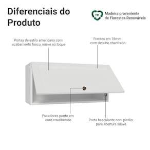 O acabamento de alta resistência da estrutura e das portas é em Branco. Possui uma textura suave ao toque, trazendo leveza e sofisticação ao ambiente. O destaque vai para os puxadores ponto em ouro envelhecido, feitos com metal resistente. Outro diferencial está no detalhe chanfrado das frentes, que forma molduras elegantes e dá profundidade ao design, refletindo o estilo americano com um toque moderno.