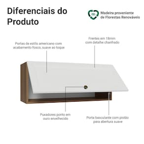 O acabamento de alta resistência da estrutura é tom amadeirado Rustic e da porta em Branco. Possui uma textura suave ao toque, trazendo leveza e sofisticação ao ambiente. O destaque vai para os puxadores ponto em ouro envelhecido, feitos com metal resistente. Outro diferencial está no detalhe chanfrado das frentes, que forma molduras elegantes e dá profundidade ao design, refletindo o estilo americano com um toque moderno.