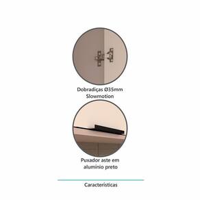Caracteristicas Estrutura: MDP 15mm Acabamento da Caixaria/Corpo: PF Acabamento das Portas/Frontal: BP Quantidade de Portas: 2 de Abrir Tipo de Dobradicas: Metalicas 35mm Slow Motion Quantidade e Tipo de Puxadores: 2 Puxador em Aluminio Preto Sistema de Montagem: Cavilhas e parafusos. Garantia do Fabricante: 3 meses Itens inclusos: Armario aereo, manual de montagem, ferragens e acessorios.
