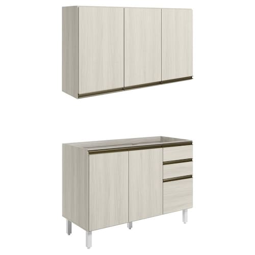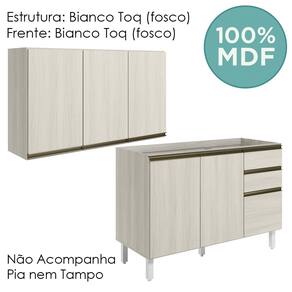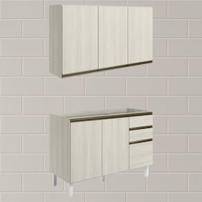 Conjunto de Armário Aéreo e Balcão sem Tampo para Pia, funcional e moderno, ideal para composições que otimizam o espaço com elegância. Fabricado 100% em MDF, com estrutura de 15mm, forro de fundo de 3mm e acabamento em pintura UV (fosco ou brilho). O Conjunto é composto por 1 armário aéreo com 3 portas com dobradiças de 35mm com amortecedor, que garantem fechamento suave e silencioso, além de puxadores em perfil de alumínio e 2 prateleiras internas. O Balcão conta com 3 gavetas com corrediças telescópicas, 1 prateleira interna e 2 portas com dobradiças de 35mm com amortecedores. Os 5 pés possuem altura de 15,5cm com regulagem adicional de 1,5cm, garantindo estabilidade em qualquer piso. Não acompanha tampo nem pia. Estes móveis chegarão em sua casa separados em 04 volumes.