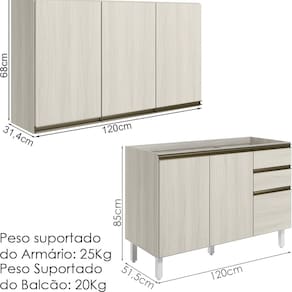 Peso Suportado do Balcão: 20Kg (12Kg gavetas e 8Kg prateleira)