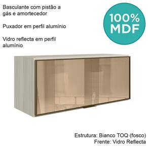 Armário Aéreo Basculante para cozinha desenvolvido para composições modernas e funcionais. Fabricado 100% em MDF, com estrutura de 15 mm e forro de fundo de 3 mm. Além disso, conta com pistão a gás com amortecedor, que garantem fechamento suave e silencioso, mantendo a porta aberta em um ângulo ideal e proporcionando mais conforto e segurança no uso diário. O puxador em perfil de alumínio completa o produto com um visual funcional e contemporâneo, enquanto o vidro reflecta traz um toque sofisticado e reflexivo, ampliando visualmente o ambiente com elegância. Este móvel chegará em sua casa separado em 02 volumes.