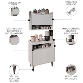 O armário aéreo ao aproveitar o espaço superior da parede, é perfeito para manter as louças, utensílios de cozinha e demais objetos sempre organizados e com facilidade de acesso. Mais que funcionalidade, esse armário 2 portas também agrega um toque de elegância, já que conta com um nicho que pode ser aproveitado para dispor decorações. Já o aparador foi projetado para aprimorar a experiência em família e com, uma vez que o seu design versátil adequa-se perfeitamente em diversos ambientes, desde cozinha, como apoio para louças, sala de jantar como buffet compacto ou até mesmo como balcão cantinho do café; afinal, proporciona não somente armazenamento prático e organizado, como também toque de aconchego ao ambiente, seja ele qual for.