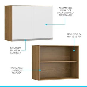 Armário Aéreo Cozinha 2pt 80x60 Mdp Branco Avelã Menu Móveis Branco Avelã O Armario Aereo de Cozinha Sabrina foi desenvolvido para atender todas as suas necessidades diarias com um design moderno, cheio de personalidade, beleza e versatilidade. Por se tratar de armario de cozinha modulado voce pode ajustar os modulos conforme o espaco disponivel e montar diversas modulacoes diferentes para deixar o ambiente muito mais aconchegante. A elegancia fica por conta dos puxadores em perfil na cor prata dando um toque unico de sofisticacao. Produzido com materiais de excelente qualidade, garantindo a durabilidade e vida util. O melhor em moveis no design atual aliando conforto, qualidade e otimos precos, so na Menu Moveis! Caracteristicas: Produzido em MDP de 15 mm Acabamento UV na cor Avela e Branco Texturizado Portas com Dobradicas Metalicas Puxadores Perfil em ABS na cor Prata Prateleiras suportam 5 Kg