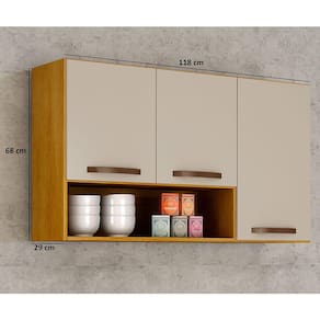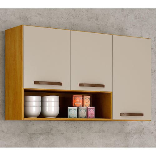 O Aéreo 3 portas Maísa é ideal para organizar seu espaço com praticidade e rapidez. Tem 3 portas com dobradiças metálicas para abrir e fechar com segurança, 1 prateleira e puxadores em abs bronze. O armário possui um design elegante para complementar sua cozinha ou despensa.