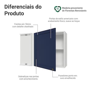 O acabamento de alta resistência da estrutura é em Branco e da porta em Azul. Possui uma textura suave ao toque, trazendo leveza e sofisticação ao ambiente. O destaque vai para os puxadores ponto em ouro envelhecido, feitos com metal resistente, que adicionam personalidade e um charme único. Outro diferencial está no detalhe chanfrado das frentes, que forma molduras elegantes e dá profundidade ao design, refletindo o estilo americano com um toque moderno.