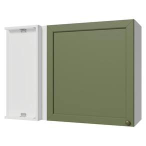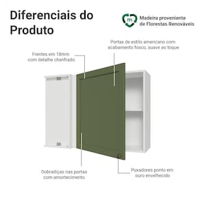 O acabamento de alta resistência da estrutura é em Branco e da porta em Verde. Possui uma textura suave ao toque, trazendo leveza e sofisticação ao ambiente. O destaque vai para os puxadores ponto em ouro envelhecido, feitos com metal resistente, que adicionam personalidade e um charme único. Outro diferencial está no detalhe chanfrado das frentes, que forma molduras elegantes e dá profundidade ao design, refletindo o estilo americano com um toque moderno.