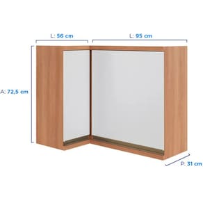Características: Marca: Telasul Modelo: Macadâmia Tipo: Armário aéreo de canto Quantidade de portas: 2 portas Quantidade de prateleiras: 2 prateleiras Tipo de dobradiças: Slow motion com amortecedor. Material da estrutura: MDP Material das portas: MDP