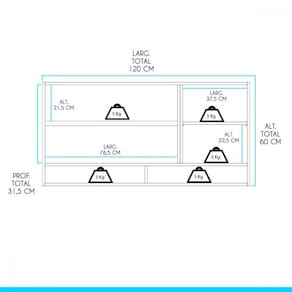 Dimensoes: Altura: 60 cm Largura: 120 cm Profundidade: 31,5 cm Peso: 24,5 kg