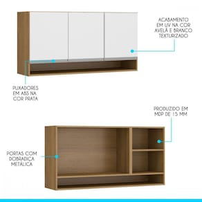Armário Aéreo De Cozinha 3 Pts 120 X 60 Cm Nicho Menu Móveis Avelã Branco O Armario Aereo para Cozinha Sabrina foi desenvolvido para atender todas as suas necessidades diarias com um design moderno, cheio de personalidade, beleza e versatilidade. Por se tratar de armarios de cozinha modulados voce pode ajustar o modulo conforme o espaco disponivel e montar diversas modulacoes diferentes para deixar o ambiente muito mais aconchegante. A elegancia fica por conta dos puxadores em perfil dando um toque unico de sofisticacao. Produzido com materiais de excelente qualidade, garantindo a durabilidade e vida util. O melhor em moveis no design atual aliando conforto, qualidade e otimos precos! Caracteristicas: Produzido em MDP de 15 mm Acabamento UV Portas com Dobradicas Metalicas Puxadores Perfil em ABS Prateleiras suportam 5 Kg