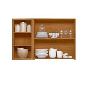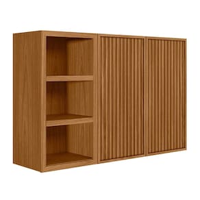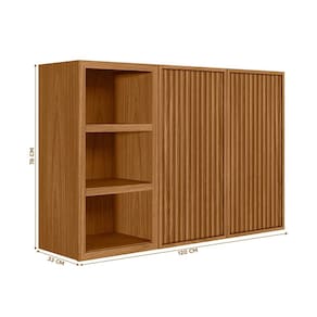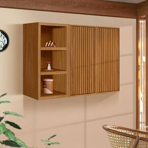 Feito inteiramente em MDF, este armário destaca-se com porta basculante, nicho decorativo e porta em ripado. Possui também três prateleiras e dobradiças metálicas para maior durabilidade.