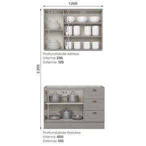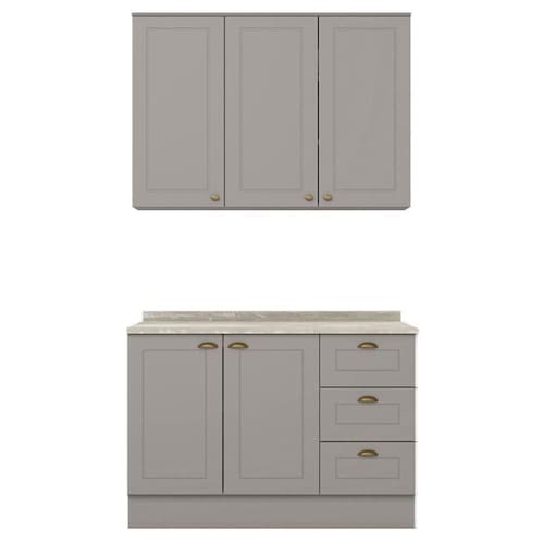No estilo provençal com conceito inspirado nas cozinhas estilo americano. Um conjunto modular de cozinha sendo 3 peças: 1 armário aéreo 3 portas 120 cm, 1 balcão de 120 cm e 1 tampo de 120 cm. Todo o conjunto com estrutura feita 100% MDF de 15mm (fundo com 3mm, tampo em MDP de 25mm) , portas com dobradiças metálicas 35 mm com amortecimento e fechamento suave, e 3 gavetas com corrediças telescópicas, suportando 3kg cada, sua interna conta com 4 prateleiras espaçosas, cada uma suportando até 8 kg. Cozinha com acabamento em pintura UV texturizada, com portas e gavetas com detalhes de usinagem em baixo relevo que proporciona beleza e facilidade ao limpar, além do destaque em seus puxadores em metal zamac, tampo de 120 x 53,5 cm. Este móvel chegará na sua casa separado em 03 volumes.
