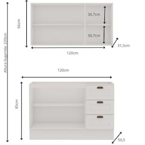 Um conjunto modular de cozinha sendo 2 peças: 1 armário aéreo 3 portas 120 cm, 1 balcão de 120 cm.
