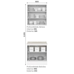 No estilo provençal com conceito inspirado nas clássicas cozinhas . O Armário Aéreo com Balcão com tampo de 80 cm, com estrutura feita 100% MDF de 15mm (fundo com 3mm, e tampo em MDP 25mm) , portas com dobradiças metálicas 35 mm com amortecimento e fechamento suave, frentes com usinagem em baixo relevo, enquanto os puxadores são em metal zamac, sua interna conta com 3 prateleiras espaçosas, cada uma suportando até 8 kg. Acabamento em pintura UV texturizada que proporciona beleza e facilidade ao limpar. Este móvel chegará na sua casa separado em 03 volumes.