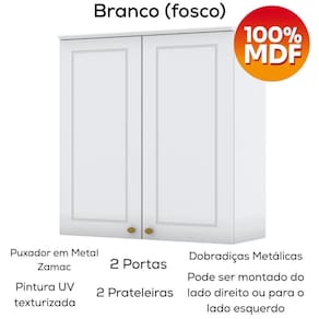 Diferenciais: Puxador metal zamac, dobradiças metálicas, corrediças telescópicas, opção de instalação sem pés, suspenso (ferragens para fixação na parede inclusas).