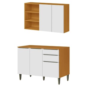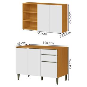 Armário Aéreo e Balcão Com Tampo, design pratico e resistente para transformar sua cozinha. Estrutura em MDF (15/12 mm) e acabamento em Verniz. Possui portas com dobradiças metálicas, gavetas com corrediças telescópicas, puxadores e pés em plástico (pés 15 cm, regulagem de 3cm), prateleiras internas e nichos laterais funcionais. Tampo já incluso (não acompanha pia). Estes produtos serão entregues em 2 volumes.