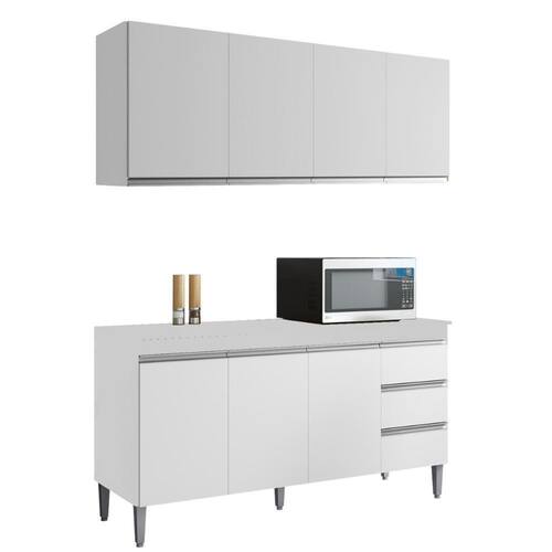 Armário Aéreo e Balcão com Tampo Andreia, ideal para otimizar o espaço da sua cozinha. Produzido em MDP 12/15 mm (fundo 3 mm) com pintura UV. Possui portas e gavetas com dobradiças e corrediças metálicas, puxadores em alumínio e prateleiras internas. O balcão conta com pés em plástico com regulagem. Produto entregue em 03 volumes.