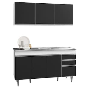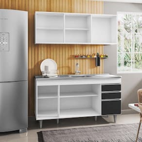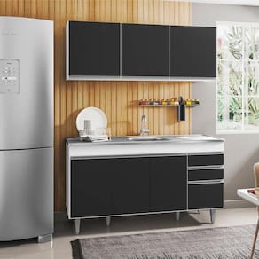 Quanto ao acabamento e estrutura também não há o que questionar, porque são fabricados em MDP 15mm com acabamento BP e os puxadores em alumínio modelo cava dão um toque de modernidade. Para completar, o tampo de pia em inox agrega ainda mais utilidade, pois você terá um espaço ideal para o preparo das refeições, além da cuba central ser ampla e acompanhar a válvula com ralo que servirá de peneira para resíduos, evitando assim, eventuais entupimentos no encanamento da pia.