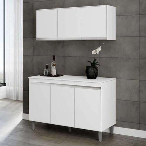 Renove sua Sala de Jantar ou Cozinha com quem entende. O Armário Aéreo e Balcão Gabinete Cozinha Manu 120cm Com Tampo 3 Portas da AJL é a opção certa para você que procura qualidade e beleza em um só produto. Com este conjunto seu ambiente ficará completo e elegante do jeitinho que você sempre sonhou. Produzido em MDP o Balcão Manu é extremamente versátil, podendo ser utilizado como Buffet ou como Gabinete de Pia, ainda possui acabamento em UV, que garante beleza e muito mais durabilidade ao produto. Conta com 3 portas convencionais com puxadores de alumínio embutidos, não é demais? Sua cozinha merece o melhor! Qualidade e tradição que só a AJL tem. Compre já!