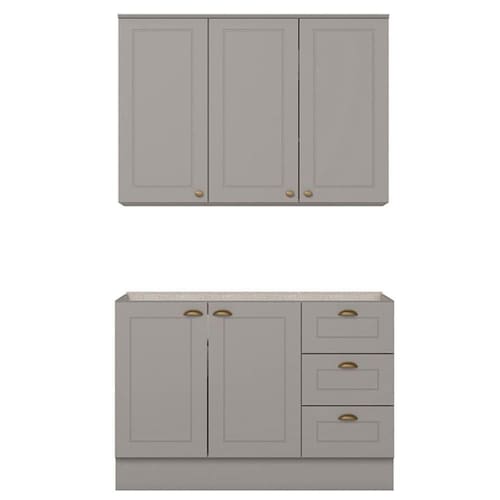 No estilo provençal com conceito inspirado nas clássicas cozinhas . O Armário Aéreo com Balcão de 120 cm, com estrutura feita 100% MDF de 15mm (fundo com 3mm) , portas com dobradiças metálicas 35 mm com amortecimento e fechamento suave, e 3 gavetas com corrediças telescópicas suportando 3kg cada, frentes com usinagem em baixo relevo, enquanto os puxadores são em metal zamac, sua interna conta com 4 prateleiras espaçosas, cada uma suportando até 8 kg. Acabamento em pintura UV texturizada que proporciona beleza e facilidade ao limpar, (NÃO ACOMPANHA PIA). Este móvel chegará na sua casa separado em 02 volumes.