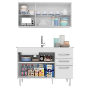 O armário conta com 3 portas que protegem o compartimento interno com 1 prateleira; já o balcão gabinete para pia conta com 3 portas e 2 gavetas, ou seja, bastante espaço para manter tudo no lugar e deixar a sua cozinha mais agradável.