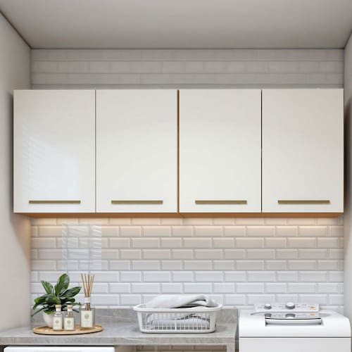 O(a) Armário Aéreo Lavanderia Guarapari 4 Portas Natural/Off White - Kaiki Móveis é produzido em MDP na escala de brilho Fosco, e possui um grau de dificuldade de montagem: Médio.