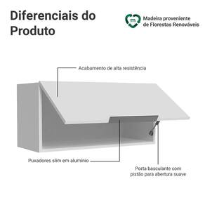 Possui uma porta basculante com sistema de pistão a gás, o módulo oferece abertura suave e mantém a porta suspensa enquanto está em uso, trazendo mais conforto e praticidade ao dia a dia. Os puxadores slim em alumínio completam o visual com um toque sofisticado. Além disso, o acabamento branco de alta resistência garante durabilidade e fácil combinação com diferentes estilos de decoração.