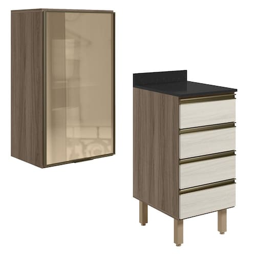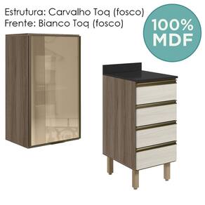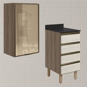 Conjunto de Armário Aéreo Porta em Vidro e Balcão com Tampo para cozinha, funcional e moderno, ideal para composições que otimizam o espaço com elegância. Fabricado 100% em MDF, com estrutura e tampo de 15mm e forro de fundo de 3mm, o conjunto é composto por 1 armário aéreo com 1 porta com frente em vidro reflecta em perfil alumínio com dobradiças de 35mm com amortecedor, que garantem fechamento suave e silencioso, 1 prateleira interna, e 1 balcão com tampo que conta com 4 gavetas com corrediças telescópicas, puxadores em perfil alumínio e 4 pés com altura de 15,5cm e regulagem adicional de 1,5cm, assegurando estabilidade em diferentes tipos de piso. Estes móveis chegarão em sua casa separados em 05 volumes.