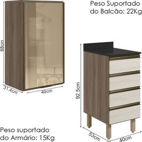 Peso Suportado do Balcão: 22Kg (10Kg tampo, 03Kg prateleira)