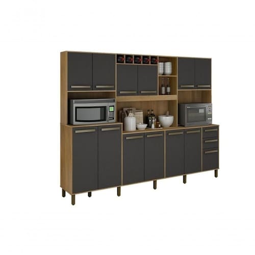 Armario Agata 13 Portas 2 Gavetas 5 Nichos Valdemoveis Cinamomo/grafite Dimensões: Largura: 2530 mm Altura: 2000 mm Prof.: 450 mm Peso: 122,500 kg Cubagem: 0,250 m3 Volumes: 3 caixas Espaço do produto: Tampo central 1795x490 mm (LxP) Nicho lateral 700x450x570 mm (LxPxA) Nicho micro-ondas 700x450x430 (LxPxA)
